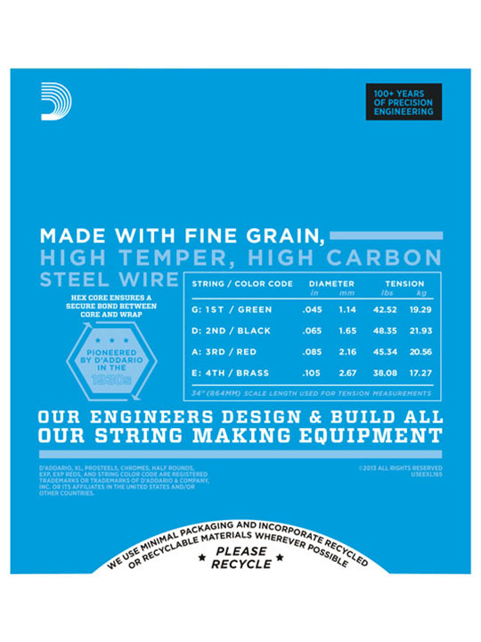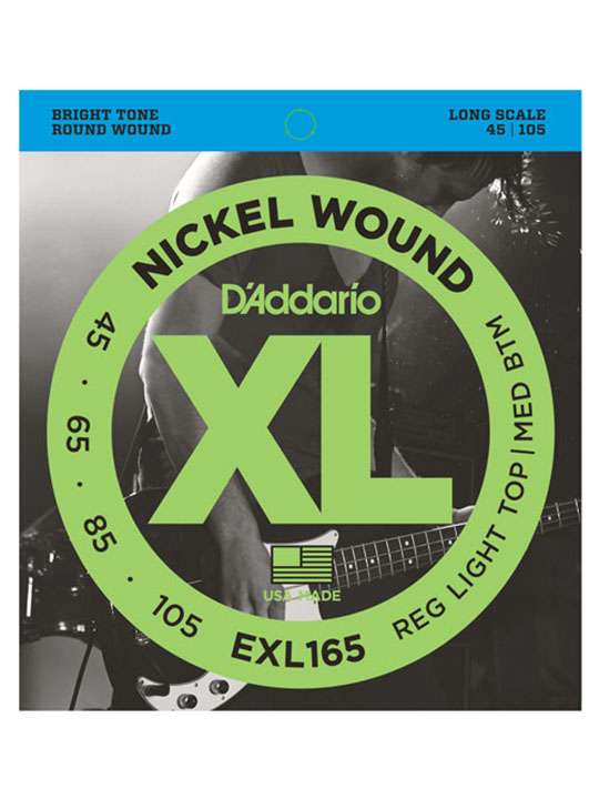 - EXL165 is a popular D'Addario hybrid bass set combining the high strings from an EXL170 (.45 and .65) with the low strings from an EXL160 (.85 and .105). This set is optimal for players looking for the ideal combination of a comfortable playing tension with distinctive brightness and booming, tight lows. Fits basses with a string scale length of up to 36 1/4 inches.