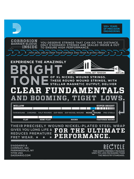 D’Addario XL Nickel Wound Electric Bass strings are world-renowned as “The Player’s Choice” amongst bass players of all genres and styles. All XL strings are precision wound on our exclusive digitally-controlled machines, ensuring each string has excellent intonation, clear fundamentals, and unparalleled consistency. Each string is wound with a nickelplated steel wrap wire known for distinctive bright tone with excellent magnetic output delivering a universally appealing and versatile tone for all playing styles.