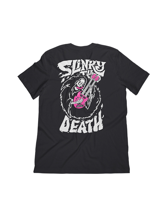 - Cheat Death with this ripping Slinky graphic! Featuring our classic Ernie Ball stack logo on the left chest with a full shred fest on the back. Screen printed white/pink ink on black poly cotton jersey t-shirt. 65% polyester, 35% combed ring-spun cotton, 3.5oz fabric.