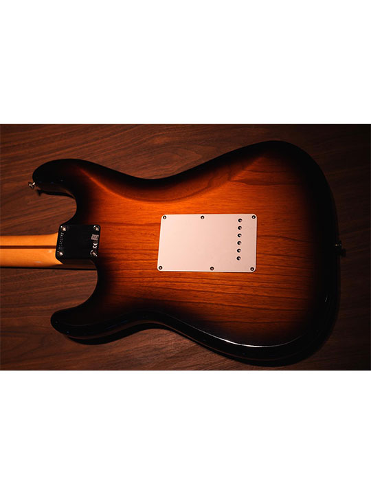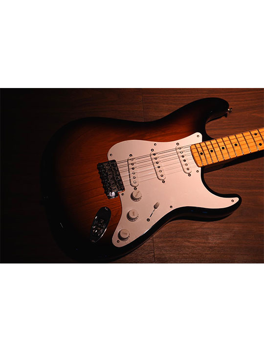 The two-piece ash body features a sideseam and a flash-coat lacquer finish in the guitar's original two-color Sunburst. The one-piece maple neck has a comfortable 1954 profile and date stamp just below the truss rod adjustment nut, topped by a 7.25"-radius fingerboard with rolled edges and 21 vintage frets. Three modern 1954 single-coil Stratocaster pickups deliver a singing original-era voice, with five-way switching complemented by an included optional three-way switch for original wiring. The guitar also features a single-ply white pickguard and white polystyrene control knobs, bone nut and round string tree, American Vintage synchronized tremolo bridge with six special saddles, vintage tuners and nickel-chrome hardware.