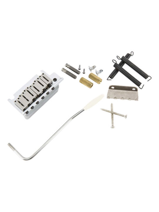 ชุดอุปกรณ์ Fender 1986-2007 American Standard Stratocaster tremolo system ครบชุดประกอบด้วย tremolo bridge assembly พร้อมบล็อกเหล็ก, แผ่นโครเมียม, saddles แบบออฟเซ็ต, ก้านคันโยกก้ามปูพร้อมสกรูและสปริง ไกด์ร้อยสาย และประแจหกเหลี่ยมสำหรับปรับความสูงของ saddle