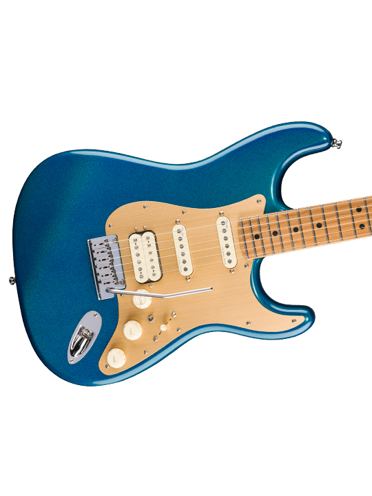Under the hood, a pair of Ultra II Noiseless™ Hot Strat® pickups paired with a Haymaker™ Humbucker deliver everything from sweet crystalline cleans to searing leads, all without a hint of hum. Our patented S-1™ switch cleverly splits the Haymaker for even more tonal variety, and the Ultra Blaster pre-amp provides a warm and punchy dB boost at the flick of a switch. Additional road-ready features include 2-Point American Ultra synchronized tremolo with pop-in arm, polished stainless steel block saddles, cold rolled steel block, deluxe locking tuners, soft-touch knobs and 1-ply anodized aluminum pickguard.