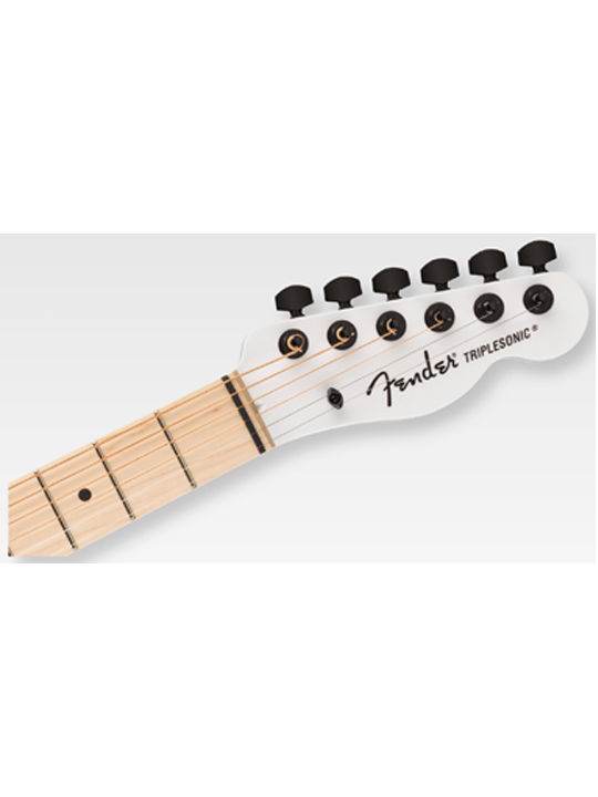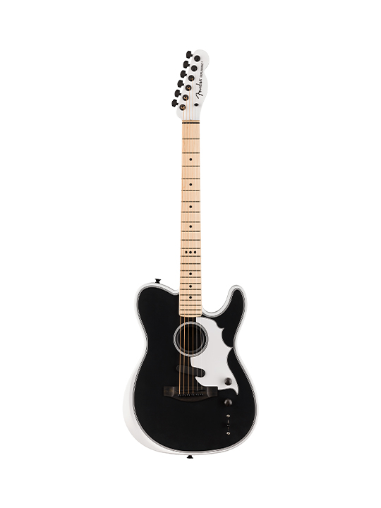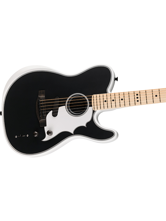 The Triplesonic Acoustasonic Tele features an Arctic White painted neck and body with black finish on the top that extends into the soundhole for a sleek, premium look.