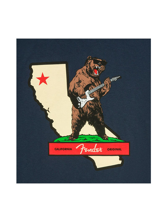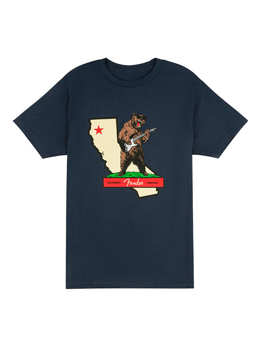 Fender rocks the world, but we started rocking in California. This 100% cotton shirt bears the California Bear shredding on a Strat®, along with our logo and the state outline.