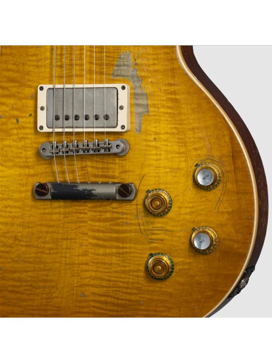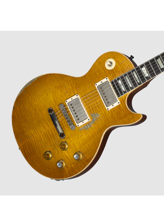 The story of “Greeny” is shrouded in mystery, but few guitars are as illustrious. Greeny is one of the most iconic original Les Paul Standards ever made, with a unique sound as recognizable as the guitar itself. Previously owned by Peter Green, it was used throughout his time with Fleetwood Mac and later sold to Gary Moore, who used it for three decades with Thin Lizzy and as a solo artist. Now owned by Kirk Hammett, Greeny has passed through the hands of three legendary guitarists. Its distinctive sound is partly from the out-of-phase middle switch position due to the neck pickup’s reversed magnetic polarity. The Kirk Hammett "Greeny" 1959 Les Paul Standard from the Gibson Custom Shop is artfully aged to match the original by the Murphy Lab and was inspired by this legendary guitar. With its Indian rosewood fretboard, it gives players around the world the opportunity to experience some of the magic of "Greeny" for themselves. A brown/pink Lifton™ reissue 5-latch case is also included.