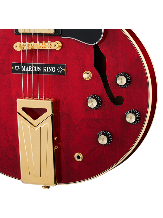 Marcus King is a singer, songwriter, and guitarist with the soul of American roots music flowing through his DNA. Hailing from South Carolina, his spine-tingling vocals and emotive guitar playing were influenced from an early age by his blues guitarist father, Marvin King, and his grandfather, a country musician. Now, before reaching the age of 30, Marcus is partnering with Gibson on a second remarkable signature model, based on the instrument that was handed down from his grandfather to his father, and finally to him as he took his family's musical legacy to stages worldwide. Originally released as a Custom Shop model, the new Marcus King ES-345 is inspired by his main guitar, a 1962 ES-345 that was handed down to him by his family. This modern version captures the look and vibe of his original, with only the features that Marcus finds essential, including mono wiring, a pair of Custombucker humbucker™ pickups, a fixed Vibrola™ tailpiece for improved tuning stability, and a stud anchor cover customized specifically for Marcus King. All of the standard ES-345 features that you’d expect are also present, including the 3-ply maple/poplar/maple body, solid maple center block for improved sustain and feedback resistance, and gold hardware, including an ABR-1 Tune-O-Matic™ bridge and Grover® Rotomatic® tuners with kidney buttons. The mahogany neck features a Rounded profile that averages .875” at the first fret and .975” at the 12th fret. The Indian rosewood fretboard is adorned with acrylic split parallelogram inlays and equipped with 22 medium jumbo frets. A Graph Tech® nut adds to the tuning stability, and the guitar is finished in classic Sixties Cherry. A Gibson hardshell case is included to keep the Marcus King ES-345 safe when it is stored or in transport.