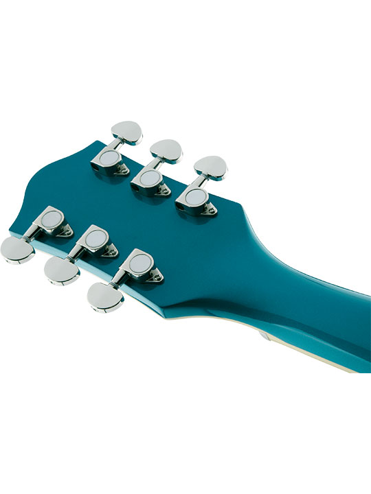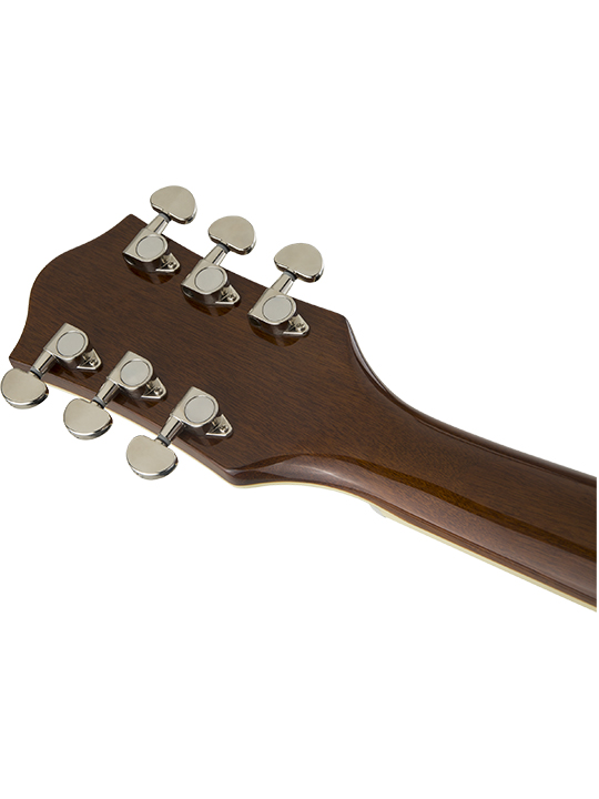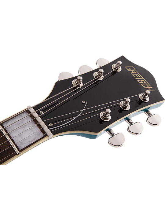 The secret to the Streamliner’s sound is twofold—the Broad’Tron™ BT-2S humbucking pickup and the spruce center block. Designed specifically for the Streamliner Collection, the high-output Broad’Tron pickup spawns improved definition with tighter bass response for robust lows, pristine highs and a throaty midrange. A lightweight spruce center block runs the length of the body, reinforcing the top while eliminating undesired feedback for volume-friendly performance on rocking stages. The Streamliner’s sonic power is harnessed and shaped by the traditional control layout—neck and bridge pickup volume controls, a master tone control, master volume control and three-way pickup switching. A fast-playing 12”-radius laurel fingerboard with elegant pearloid Big Block inlays and 22 medium jumbo frets sits atop the white-bound neck with a thin “U”-shaped profile—ideal for chord work or fiery riffing. Enjoy rock-solid tuning stability courtesy of the stylish Gretsch V-Stoptail tailpiece, anchored Adjusto-Matic™ bridge and synthetic bone nut.