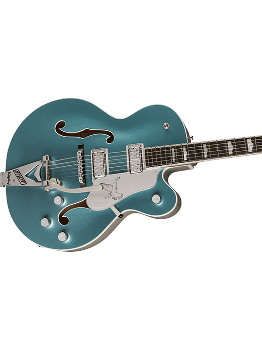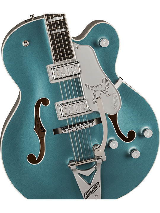 The G6136T-140 Falcon™ guitar features a 17-inch-wide hollow body with a solid Adirondack Red Spruce top, laminated maple back and sides and ML bracing.