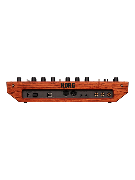 From smooth curves to muscular straight lines. The stylish visuals featuring aluminum and wood are inherited directly from the minilogue, but have been modified to a straight, direct design that bespeaks the power of a monophonic instrument. In spite of its stout construction, the compact and light-weight body is only 1.7 kg / 3.78 lbs., providing an unprecedented combination of toughness and portability.